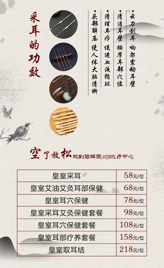 体验销魂的皇室采耳 重复放松耳朵 用手掌压住耳背,二指轻弹 这种从耳廓到耳膜再到中枢神经 最后到大脑皮层的舒爽 让人灵魂出窍再悠悠然回归原位 只有体验过才能知道! SPA水疗中心预订电话:0663-7688888转3888
