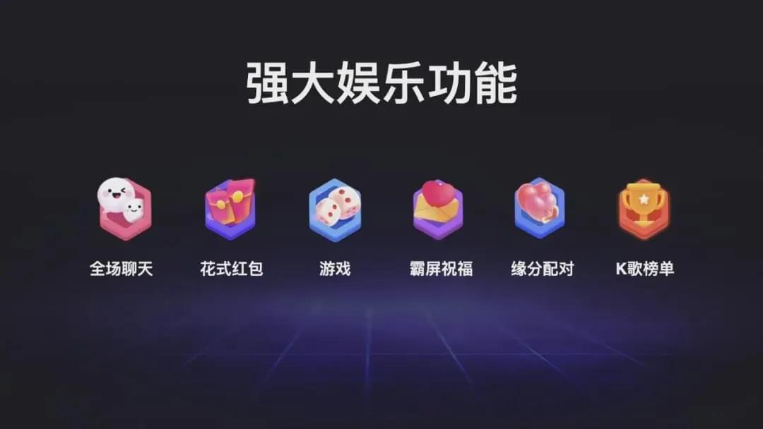 社交大厅把包厢里的大屏变成聊天室,跨包厢也能互动,还设计了霸屏祝福、互动游戏几十种玩法,供顾客选择,无形中推进了KTV的酒水促销。左右分屏的形式,想唱歌的人继续唱,想交朋友的人也能让同时享受全场互动的乐趣!