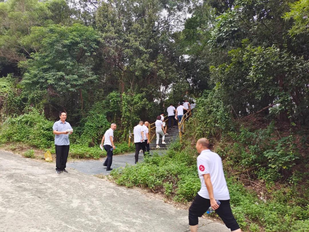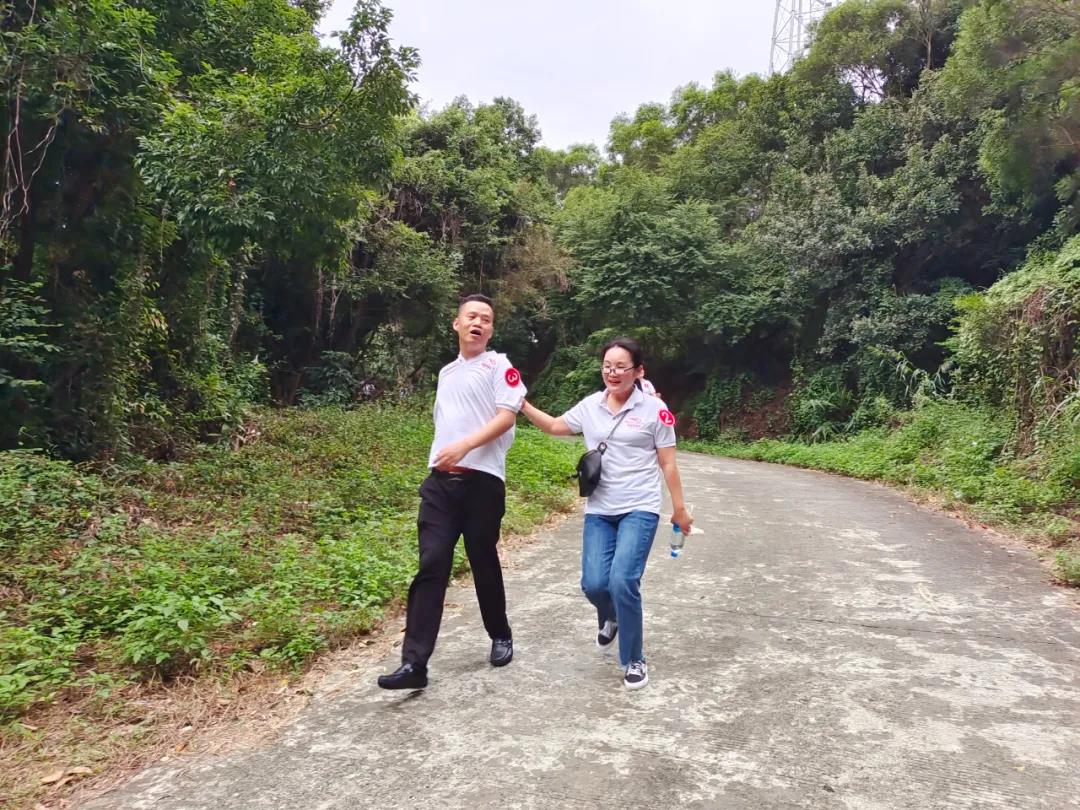 登山队伍列着整齐的队伍跑步向莲花山下,在酒店执行董事江奕宾先生宣布出发那一刻。登山队伍喷涌的热情,大家一齐向着莲花山山顶进发,个个精神抖擞,意气风发,朝着山顶迈进。因为中途下起小雨,路段湿滑,伙伴们脚步慢了下来,大家相互帮助,相互扶持,你拉我一把,我扶你一下,处处体现着团结的力量。大伙纷纷合影留念,记录下这一难忘的时刻。